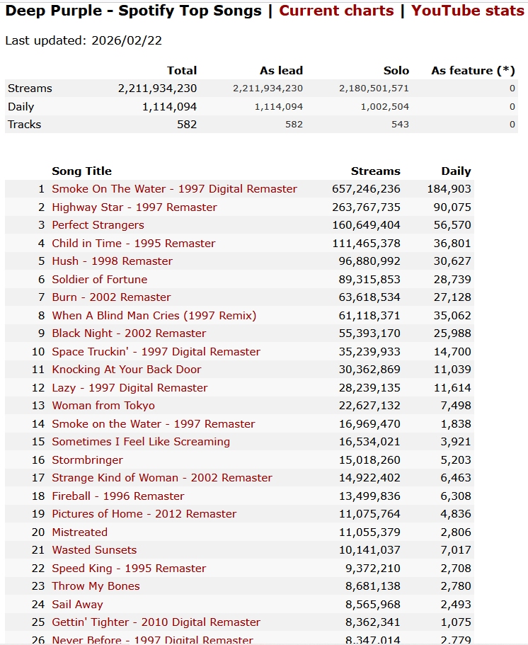 30 meistgeklickten Videos von Deep Purple auf You Tube