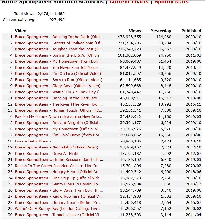 Hier ist eine von Bruce Springsteen mit seinen 30 meistgeklickten Videos.
