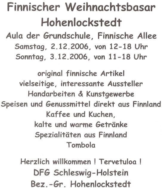 Wer einmal in den Genuß von Rentiergeschnetzeltem und -schinken, finnischer Bratwurst und dem legendären Rentierblut kommen will, dem sei am nächsten Wochenende der finnische Weihnachtsbasar in der Grundschule Hohenlockstedt empfohlen. Geöffnet ist der Basar am Samstag, 02.12. von 12.00 bis 18.00 Uhr. Am Sonntag wird bereits um 11.00 Uhr geöffnet.