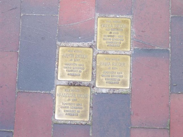 Hier betrieb das Ehepaar Aaron und Gisela Rieder ein Schuhgeschäft, bis sie mit ihren Töchtern Hannelore und Erika nach Auschwitz deportiert wurden. Sie wurden 1945 für tot erklärt.