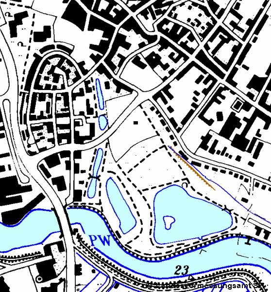 Der Ringkanal läuft auf den Malzmüllerwiesen östlich des alten Bettes des Stadtarms, ab dem heutigen "Seniorenpark" hinter Cafe Schwarz bis zum Landgericht / ZOB dann im alten Flußlauf.