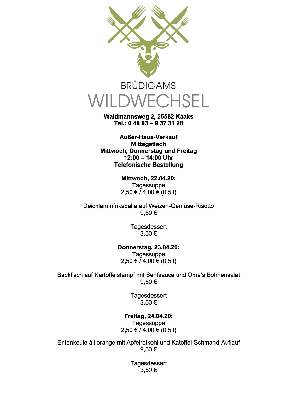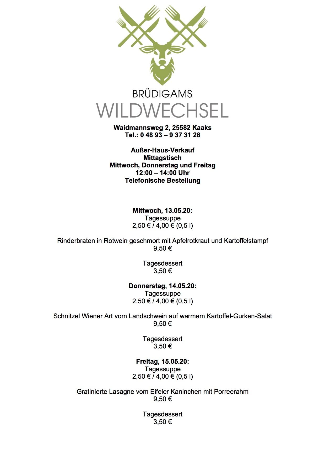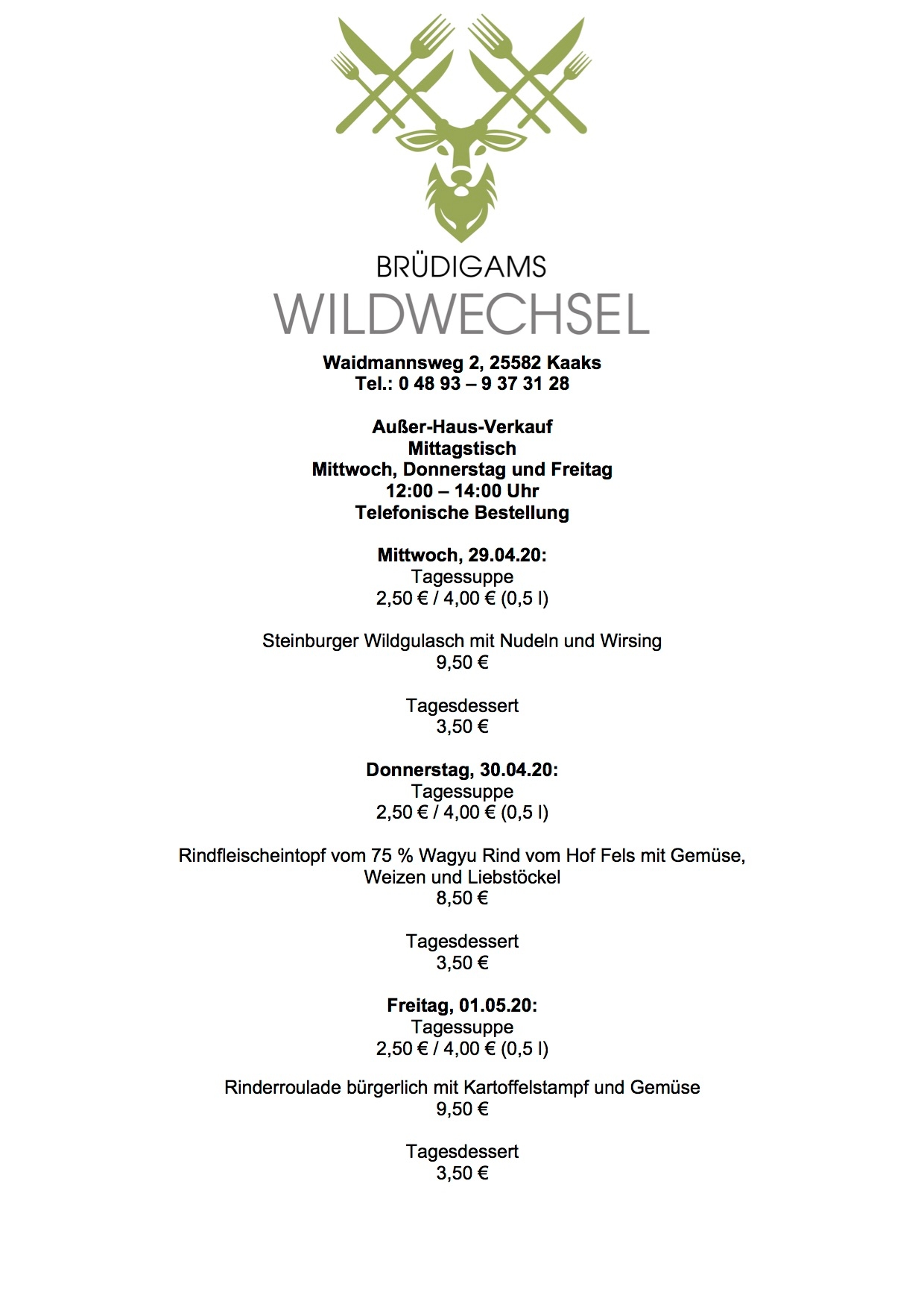 *Selbst am Feiertag, den 1. Mai, bietet Brüdigams Wildwechsel in Kaaks Mittagstisch an.
