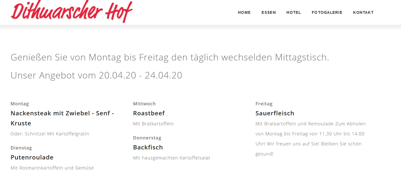 Ich stelle schon mal den Mittagstischplan für nächste Woche rein. Dithmarscher Hof vom 27.04.20 - 01.05.20