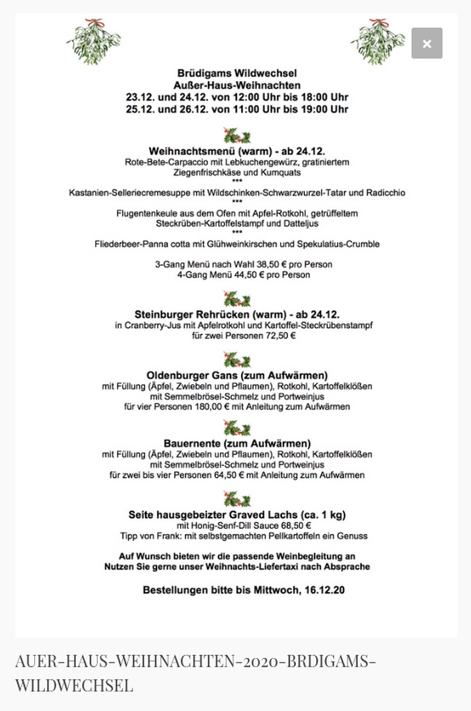 Vorbestellungen nehmen wir bis zum 22.12.2020 entgegen. Ihr bestelltes Menü erhalten Sie dann am 25. oder 26. Dezember
