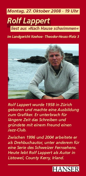 Am Montag, den 27.10.2008 um 19 Uhr im Landgericht Itzehoe ist Rolf Lappert zu Gast. Er liest aus seinem viel beachteten Roman "Nach Hause schwimmen".